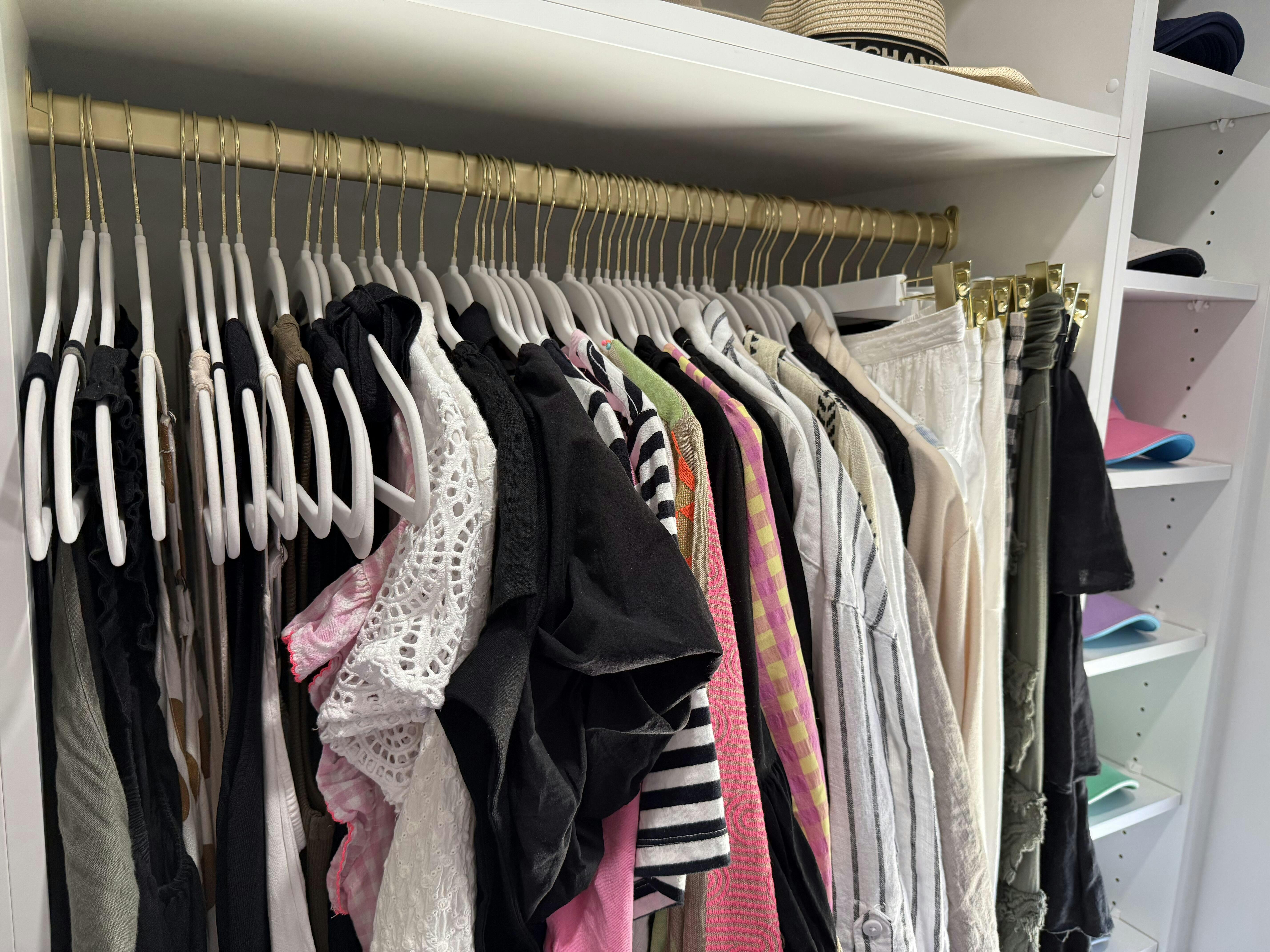 White Wooden Premium Combination Hanger w/Gold Hook & Clips - 44.5cm X 12mm Thick Sold in 10/20/50 These are great for my husbands suits to keep jacket & pants together